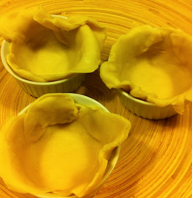 Recuperata la pasta dal frigo, stendetela finemente e foderateci delle piccole cocotte. Tenete una parte della pasta per fare i coperchi. Fate cuocere in bianco i fondi delle tartes per circa 10 minuti in forno a circa 150° finchè non sono leggermente croccanti.