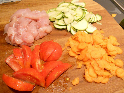 Tagliate tutte il pollo a listarelle e tutte le verdure a fettine